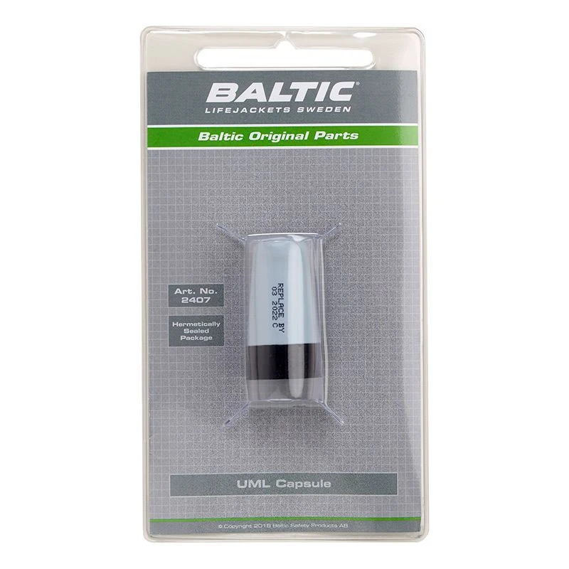 Capsule UML trigger for Baltics inflatable lifejackets. When you buy a new inflatable lifejacket it comes complete with CO2 cartridge and trigger, if your inflatable lifejacket goes off you need to recharge it with a new gas cartridge and trigger.Inside the lifejacket on the inflatable lung is printed information on which trigger is suitable for your lifejacket. E.g. „USE ONLY BALTIC Capsule UML #2407.