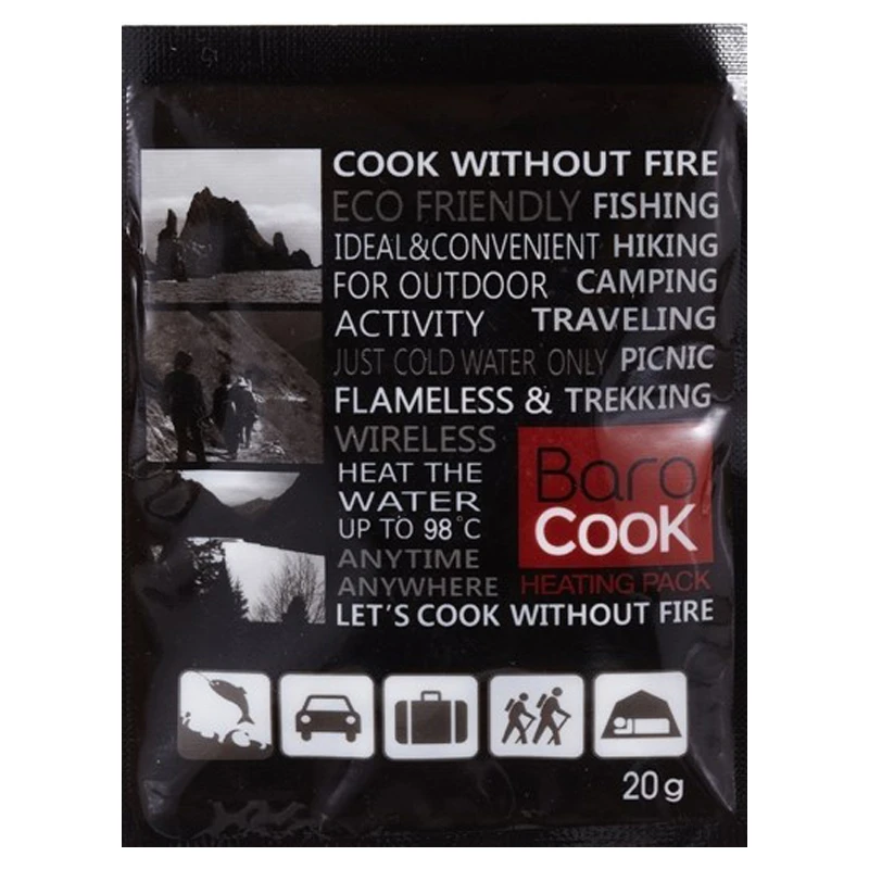 Barocook ist ein einzigartiges Produkt, bei dem Lebensmittel einfach im Feld erhitzt werden können. Ein Wärmebeutel wird mit Wasser aktiviert und dann können Lebensmittel in dem mitgelieferten Edelstahlbehälter erhitzt werden.Das Produkt kommt in einem 10er-Pack, wo jeder Beutel 20g wiegt