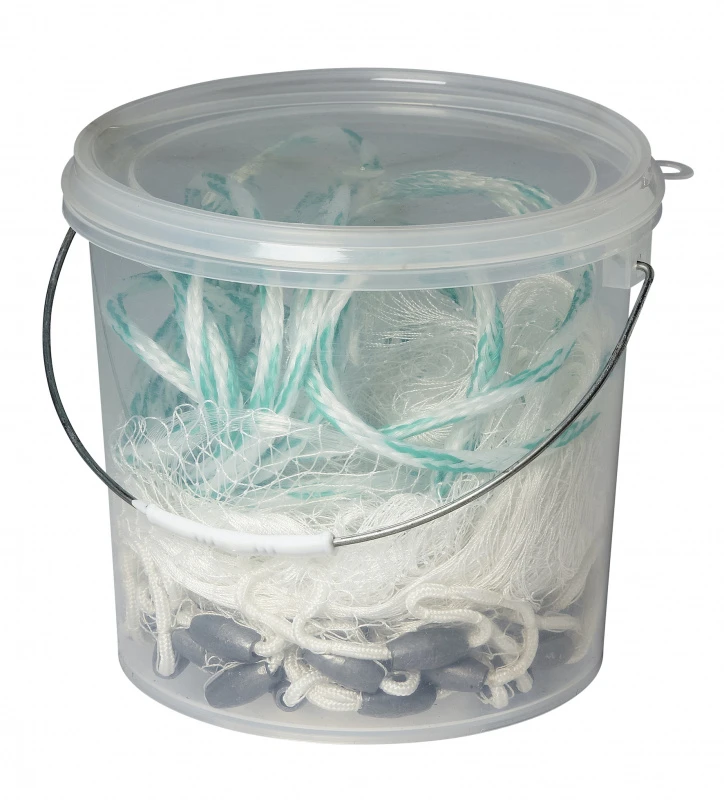 Netz zum Fang von Köderfischen1,5 cm MaschenweiteBeschichtetes Eisengewicht5 m Seil mit HandschlaufeLanglebiger Eimer im Lieferumfang