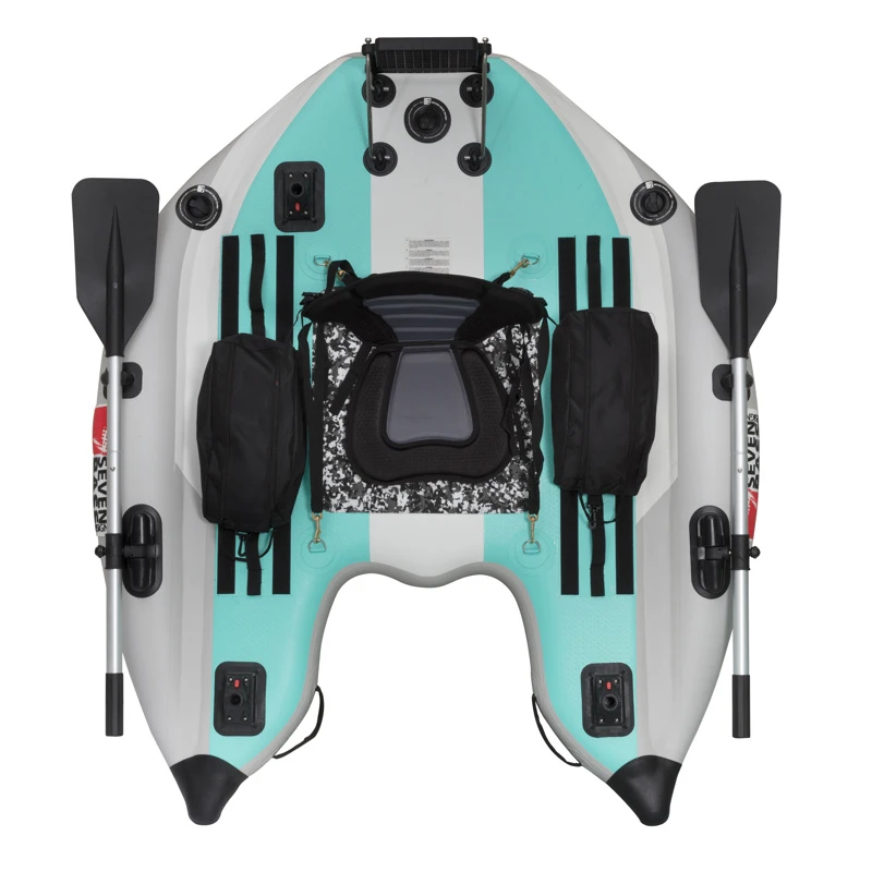 Ultimative Evolution dessen, was bei dieser Art von innovativen Produkten gemacht wird, der Flatform Junior hat keine starre Struktur.Der Flatform Junior, wie seine großen Brüder, besteht aus 3 Teilen. An den Seiten befinden sich Rollen aus PVC, die verstärkt und beschichtet sind. Der mittlere Teil ist jedoch aus 3D Mesh, dem Seven Bass Air dropstitch, gefertigt. Der Dropstich ist ein sehr feinmaschiges Polyestergewebe, das die gewünschte Form beibehält, sobald das Gerät aufgeblasen ist. Diese Netzstruktur versteift alles, damit Ihr Flatform Junior nicht wie ein großer Luftballon aussieht, sobald er aufgeblasen ist! Dies ist die so genannte „Dropstitch“-Technik.Diese Produktion wird Ihnen all die Extravaganzen ermöglichen, die Sie sich bei einem Float-Tube …. nie vorgestellt haben. In der Tat werden Sie einen Platz genießen ist eine Stabilität, die Ihnen sogar erlauben wird, auf Ihrem FLATFORM JUNIOR stehend zu fischen, trotz seiner 1,70m Länge und 1,55m Breite!Seine Herstellung ist von der besten Qualität, die es ist und die Ausrüstung ist sehr komplett mit Rudern auf den seitlichen Rollen, die es ihnen erlaubt, die Damen von höheren Schleppen, Seitentaschen mit ihrem System CLIPLINE, ein Brustbein, um einen Elektromotor zu installieren.Das Flatform Junior wird „Plug & Go Ready“ geliefert: drei „Plug & Go“ Basen sind bereits installiert, Sie müssen Ihr Boot nur noch nach Wunsch mit dem Sonarständer, GoCam Mount, Stockhalter, etc. ausstatten.Die Navigation profitiert auch von der „Bat Wing“ zwischen den Beinen, die kommen wird, um die Welle zu brechen, die erstellt wird, wenn wir den Elektromotor navigieren, haben wir auch „Rocker“ auf den beiden Punkten für eine einfache Navigation und Gleiten auf dem Wasser hinzugefügt, wenn ein wenig Kabbelwasser steigt!Wir haben es auch mit unserem „CLIPLINE-System“ ausgestattet, mit dem Sie Ihre „Flex Cargo Side Bags“ oder anderes Zubehör befestigen können, wir haben die Motorhalterung für mehr Sicherheit modifiziert.Auf dem Rumpf sind zwei kleine Flossen fest unter den Seitenflanschen positioniert, während sich eine große abnehmbare Flosse am Heck, vor der Motorposition befindet.In seiner Tragetasche verstaut, passt es leicht in den Kofferraum eines Autos. Aufgeblasen in Minuten, ist er perfekt starr dank seiner signifikanten Dicke von mehr als 16cm (6 ‚), aufgeblasen bis zu einem maximalen Druck von 15 psi für den Dropstich-Teil und 3 psi an den PVC-SeitenDer Flatform Junior ist die Spitze dessen, was Sie in Float-Tube auf dem Weltmarkt finden können, und das ist der Grund, warum er auf der internationalen Messe von EFTTEX 2019 in Brüssel, 2 Auszeichnungen gewonnen:BEST FLOATING APPAREL Saison 2019-2020VISITOR’S CHOICE Saison 2019-2020• Länge: 200 cm• Breite: 140 cm• Gewicht: 17 kg• Max: 200 kg• Kompositionen: Fallstich 15 cm en 2700g/m²• Polyester-Dichte: 1’000D• Max. Druck: 15 Psi / 1 Bar (Tropfenstich) 3,6 Psi / 0,25 Bar (PVC latéral)• Anzahl der Personen: 1• Max. Leistung: 55 LBS• Ohren: 2